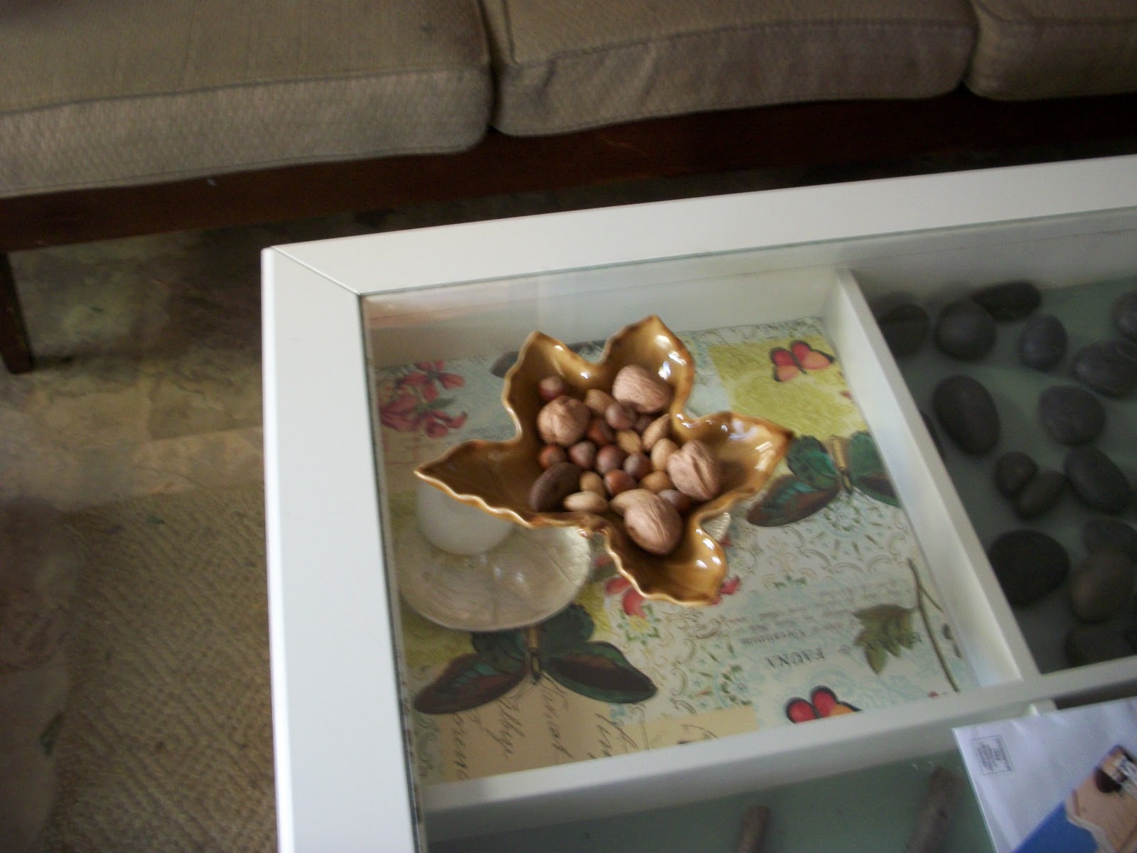 Next I added a few fall looking pieces to the coffee table and dining room table. I have no problem admitting that these are the same nuts I used in a fall centerpiece last year. Why not? No one's going to eat them right? And a quick note, I fell in love with the Pottery Barn leaf dish featured in their catalog a couple of years ago. But at almost $50 it was definitely out of the Little Green Cottage budget. I found this one at Target for about $8. Pretty sweet.